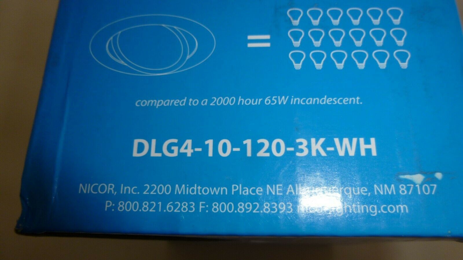 NICOR DLG4-10-120-3K-WH White 4" 3000K Adjustable LED Downlight Gimbal Retrofit Kit.  Item is new, unused and complete in a factory box.  The box may have writing or stickers as well as be a bit dirty and worn from warehouse storage.