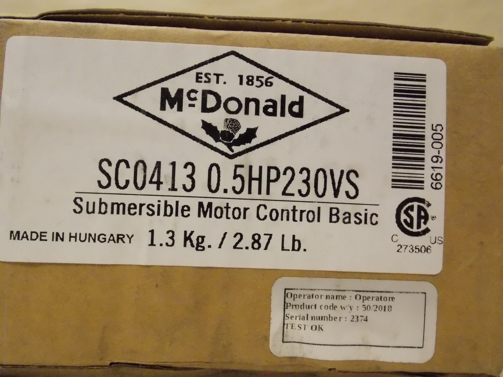 McDonald 6619-005 Submersible Motor Control SC0413 0.5HP 230VS