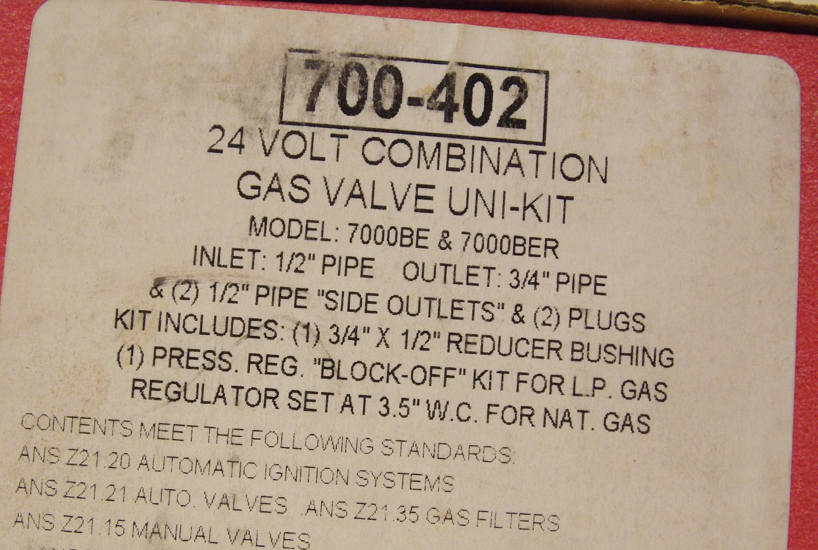 Robertshaw 700-402 for 7000BE & 7000BER 24V (GAS VALVE ONLY)