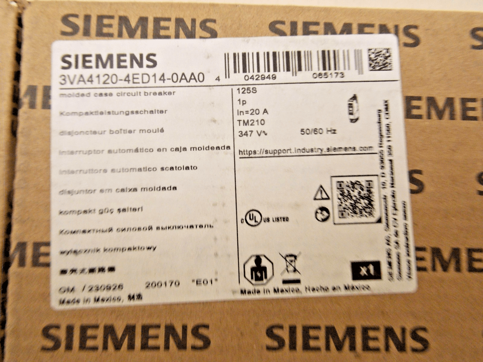 Siemens 3VA4120-4ED14-0AA0 20-Amp Circuit Breaker 1-Pole 347 VAC /125 VDC