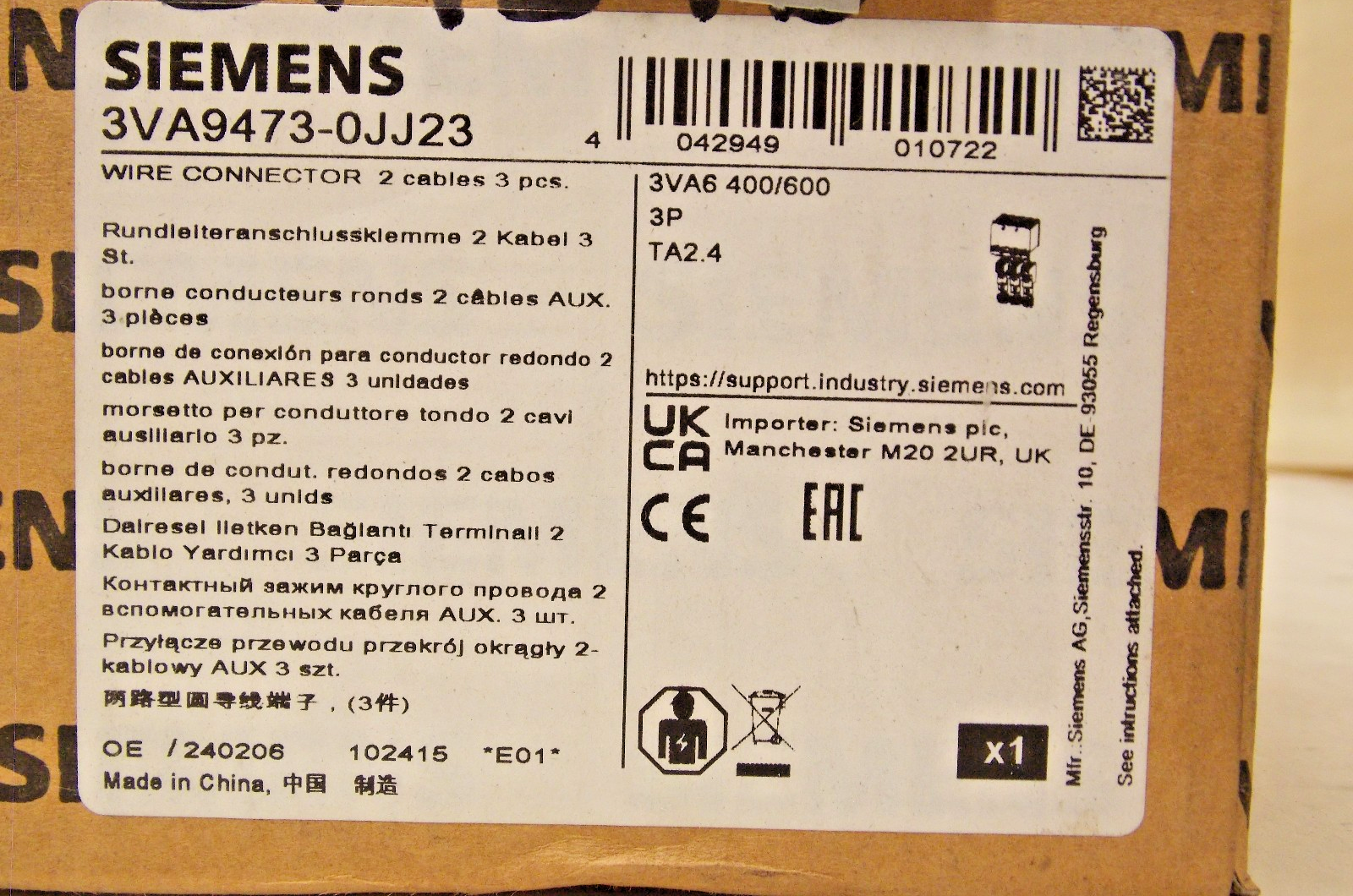 Siemens 3VA9473-0JJ23 connector 2 cables 3 units accessory for: 3VA5/6 400/600