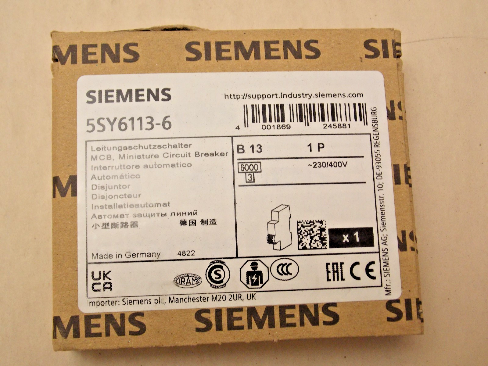 SIEMENS 5SY6113-6 Miniature Circuit Breaker 230/400 V 6kA 1-pole B 13A D-70mm