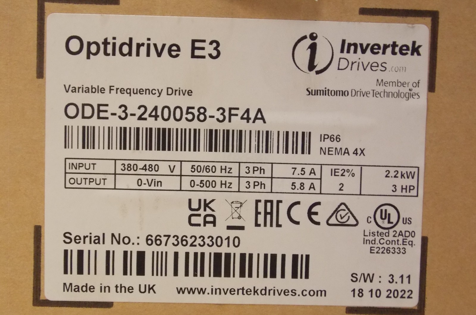 Invertek OptiDrive E3 ODE-3-240058-3F4A Invertek VFD 3HP 5.8A 380V-480V 3Ph/3Ph