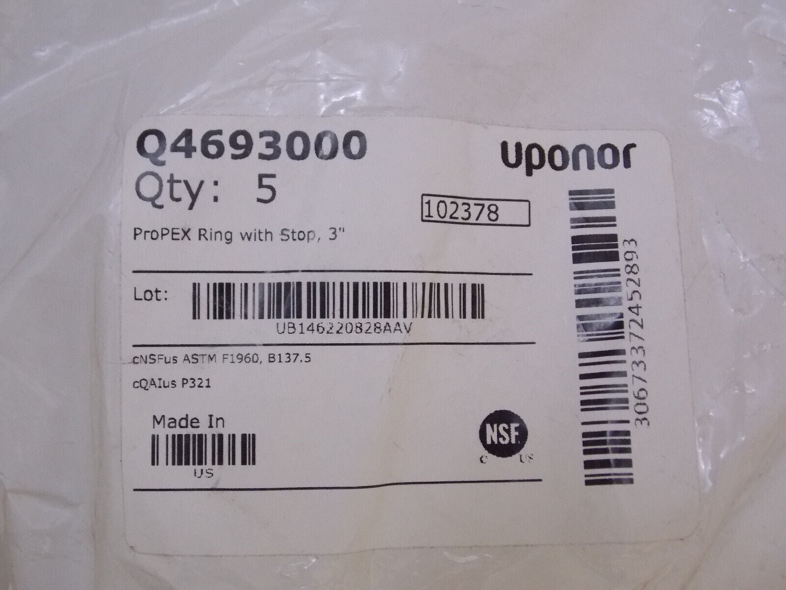 Uponor Q4693000 3" ProPEX Ring w/ Stop (Bag of 5)